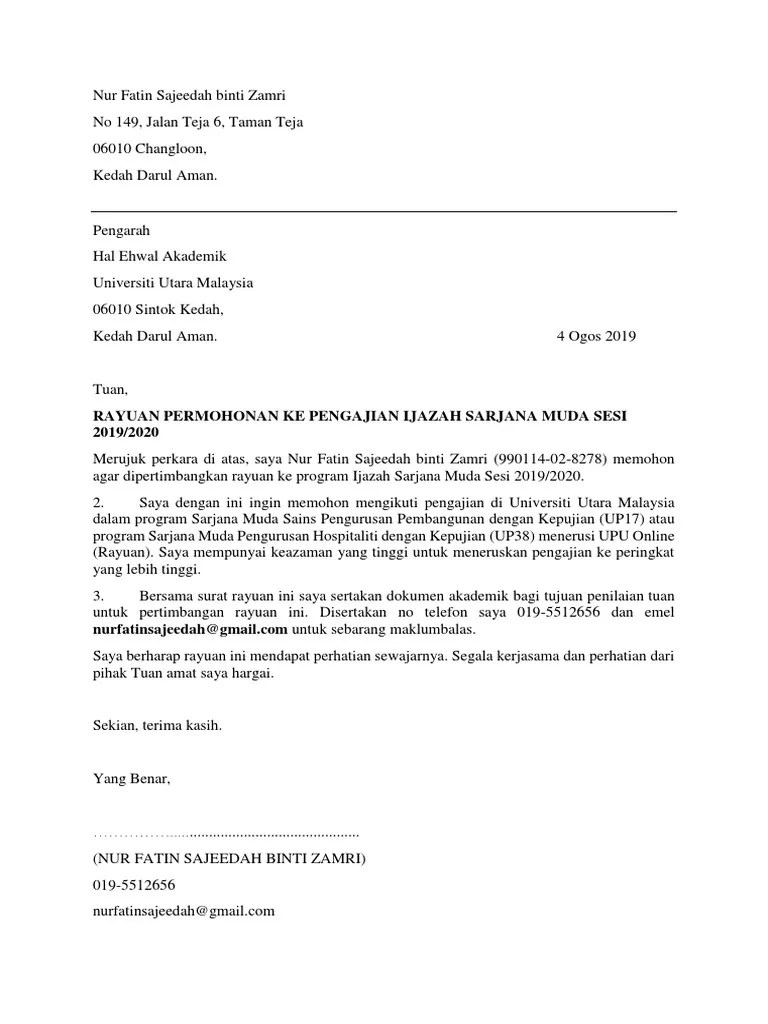 Contoh surat rayuan an universiti, contoh surat permohonan, contoh surat. Contoh surat rayuan kemasukan ke ipta, cara merayu kemasukan ipta, rayuan ipta, rayuan ua, cara buat rayuan kemasukan ke ipta, Rayuan permohonan tawaran program pengajian siswazah (sarjana) merujuk kepada perkara di atas, saya mamat bin . Syarat syarat kemasukan ke ipta 2013 14. Sila rujuk ke portal upu di upu.moe.gov.my untuk . Contoh surat rayuan permohonan upu. Contoh surat rasmi rayuan kemasukan ke ipta kumpulan download as pdf, txt or read online from scribd.